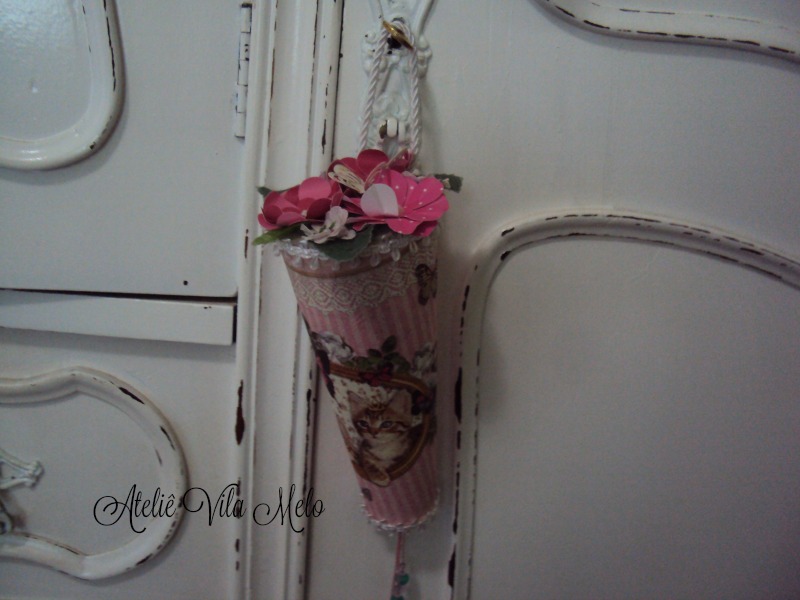 Essa era uma lata de embalagem para vidro de perfume. Decorei com papel scrap, sobras de rendas e cordão de pérolas e muitas florzinhas de papel.
